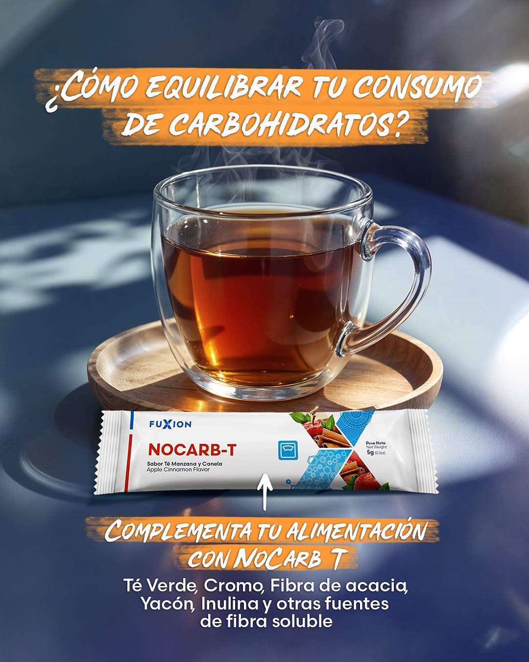 El No Carb T bloquea parcialmente la absorción de azúcares y harinas refinadas, gracias a su contenido de fibras solubles (yacon, acacia, inulina de achicoria), té verde y cromo.