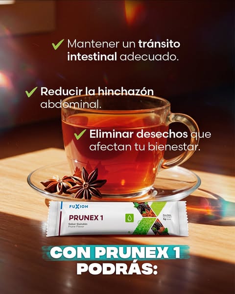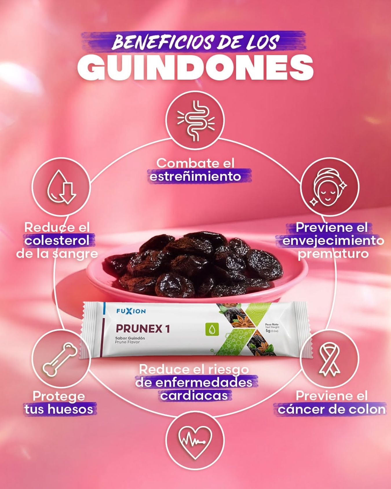 Prunex1 combina extractos naturales de guindón y mix de fibras solubles(tapioca, achicoria, psyllium), kelp entre otros que ayudan a limpiar el colon y eliminar toxinas acumuladas.